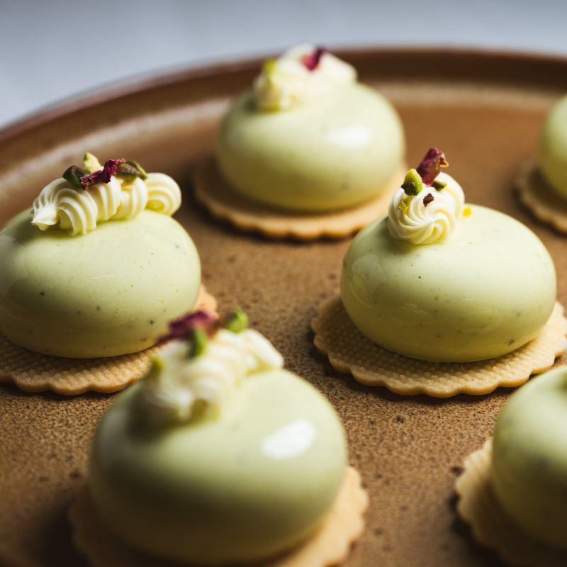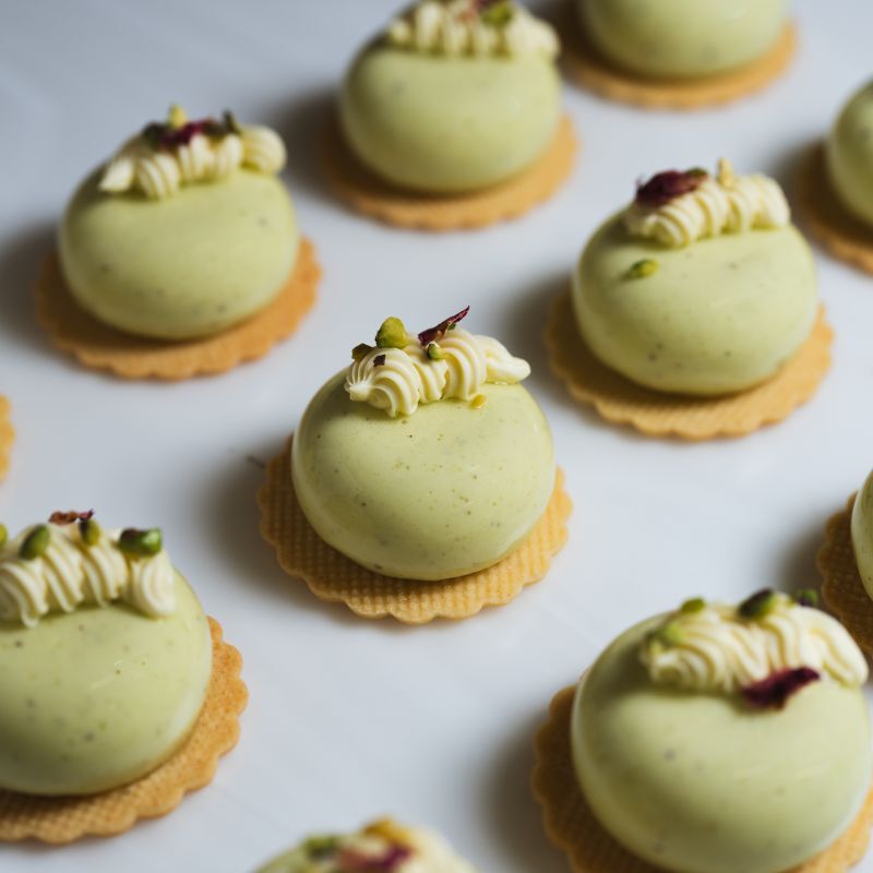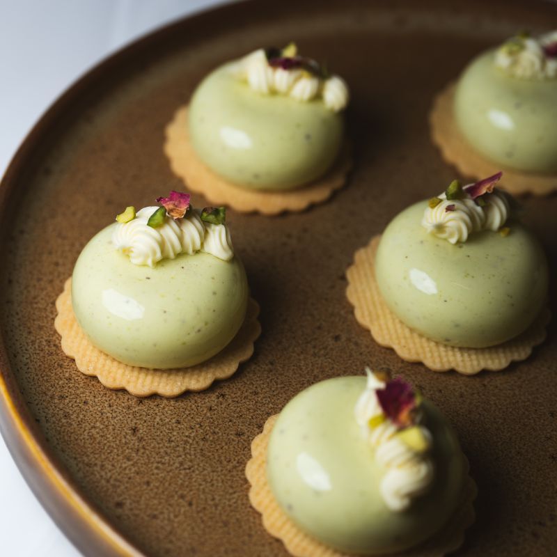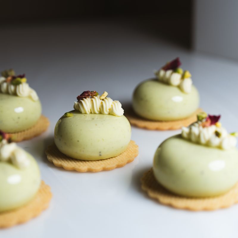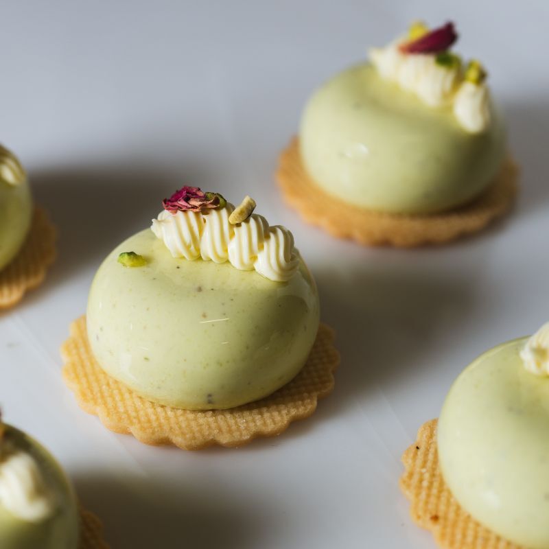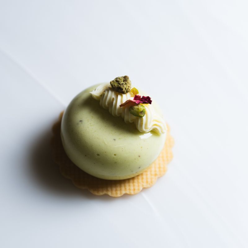 Pistachio mousse, strawberry jelly, vanilla whipped ganache & vanilla shortbread.