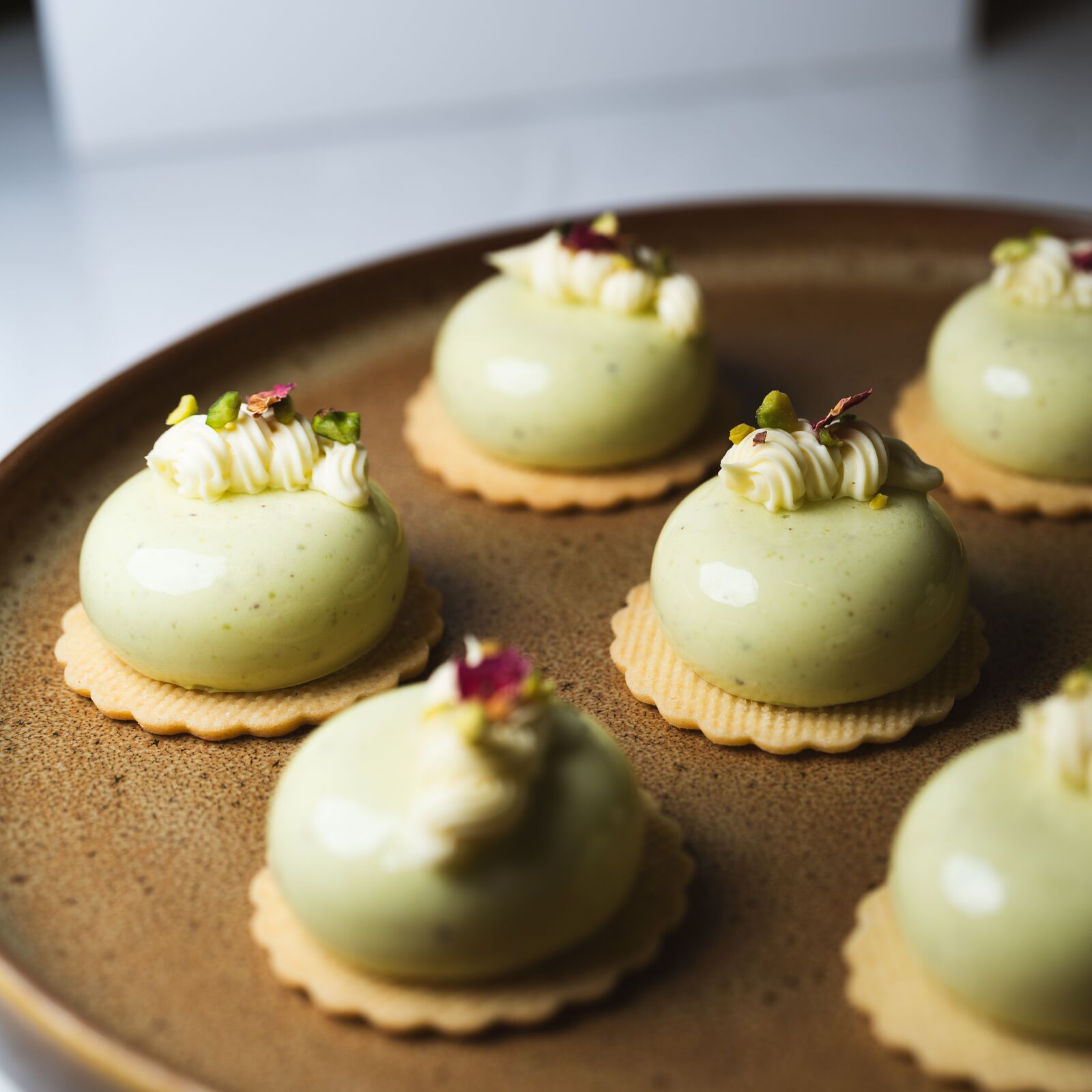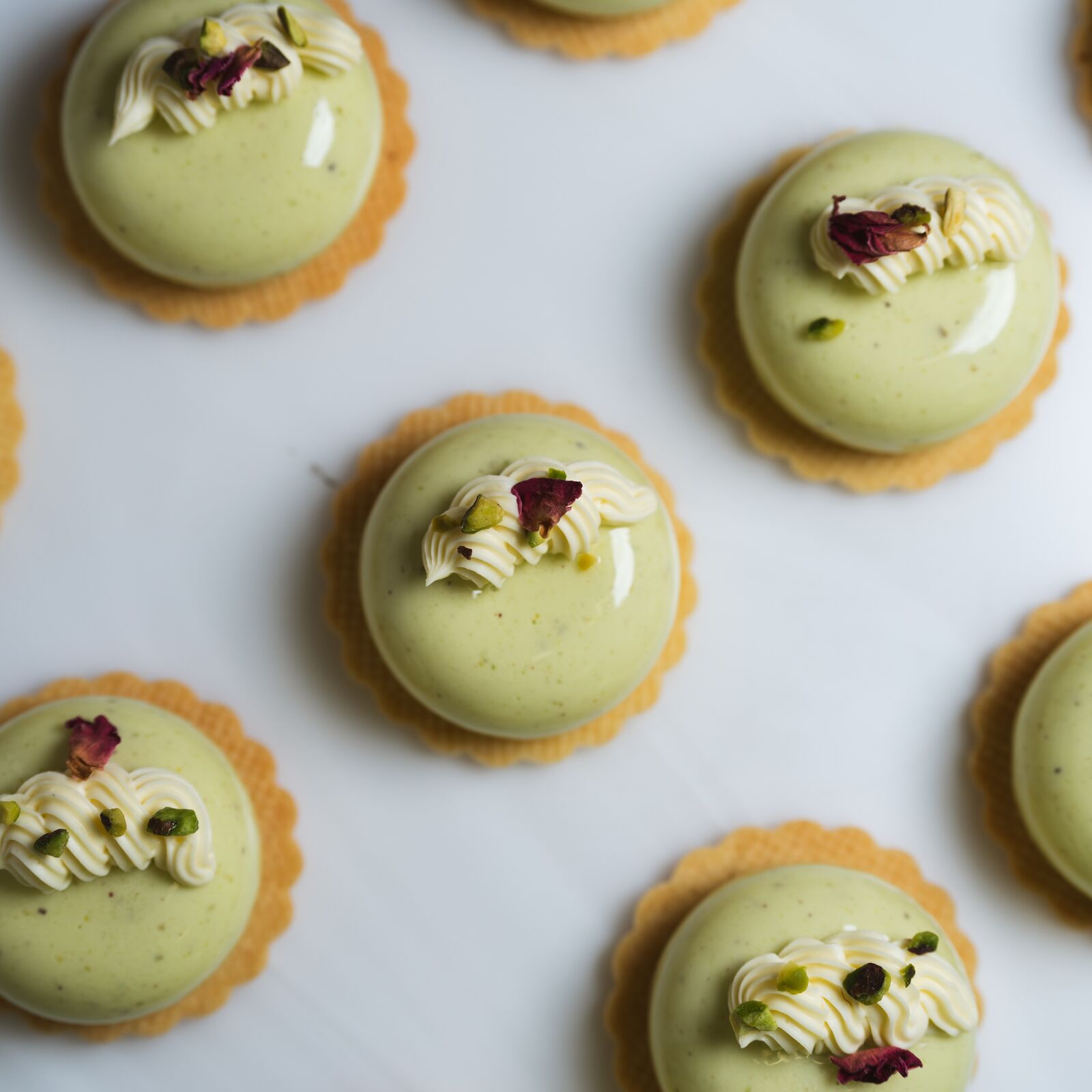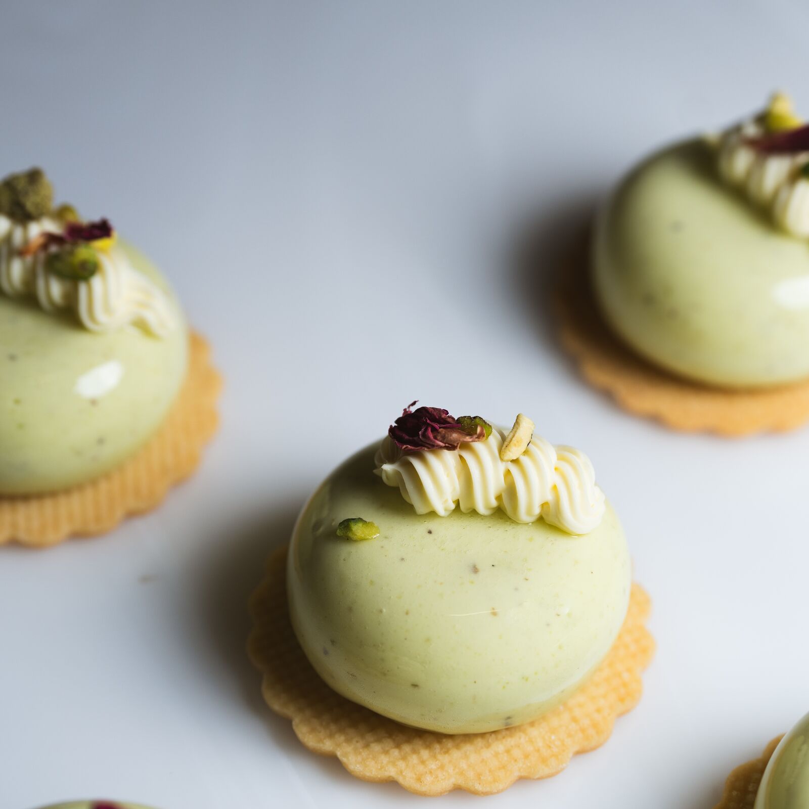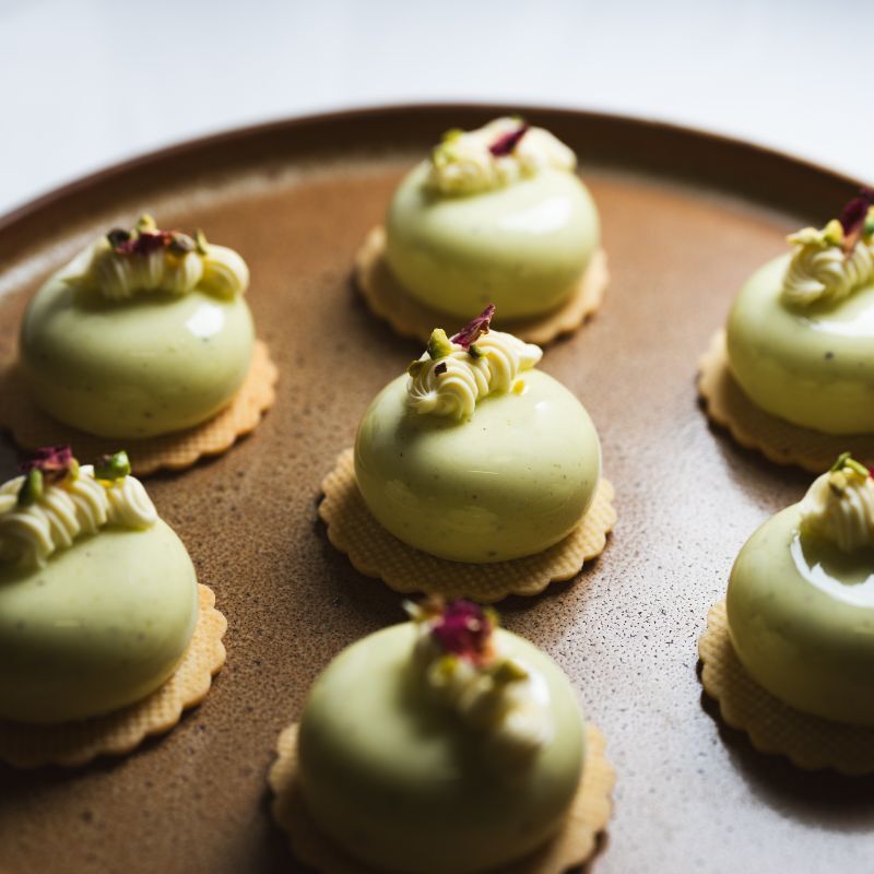 Pistachio mousse, strawberry jelly, vanilla whipped ganache & vanilla shortbread.